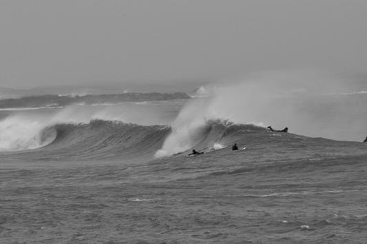 I paddled further out and waited for a decent shaped mass of water. A large left burped up on the outside, and I swung around to pick it off. As I dropped in, I realized that the rip had dragged me over by the rock cropping