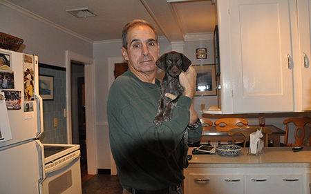 Yup. I brought little Patchy home on November 22nd, 2010. And this was the first photo of me holding Patch in our home. It seems like yesterday that this all happened. I remember driving home from Maryland at 6:00AM and needing to get home before it got too dark because I needed to catch my wave for my then CATCH A WAVE FOR MOLLY Surf Campaign. I had caught my wave the day before in the morning and drove to Maryland and spent the night. I got up at the crack of dawn and met the breeder of FIELDMASTER'S SHORTHAIRS, Robert Grove.