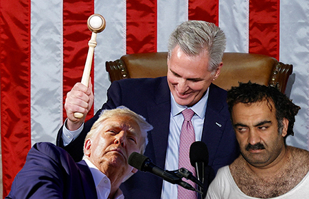 This is a rare and exclusive photo of Speaker of The House Kevin McCarthy playing WHACK A MOLE with 45 and KSM. Once Khaliddy caught wind of the game he opted out. He thought the game was silly and degrading. Though 45 who is a glutton for punishment (how else do you account for his never ending stream of constant bullshit and lies) was all in. A few whacks to the Orange Headed Menace's noggin set the tone for the rest of the game. In the end, McCarthy let 45 win. Turns out he couldn't bear the thought of 45 crying and complaining about losing again.
