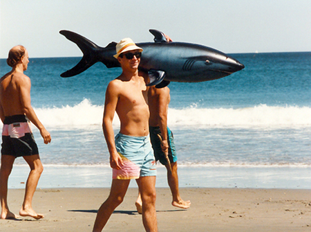 This is a still from the opening credits of my old reel to reel movie called WAVE WARRIORS. That's Tony Berardini on the left. This was in 1988 I believe. I remember this whole scene. Duffy was supposed to be on a surfboard when the inflatable shark shows up. Though in typical Duff fashion,