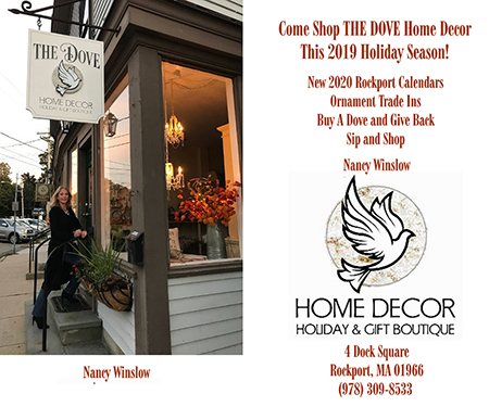 I am running The DOVE ad for our dear friend Nancy Winslow again. This shop is one of the coolest Christmas Shops on Cape Ann. Nancy and David have done a wonderful job making this little Gift Boutique a "must see and shop stop" in Rockport, MA. Stop by and say hello to Nancy and pick up something unique for the Holidays this 2019 season.