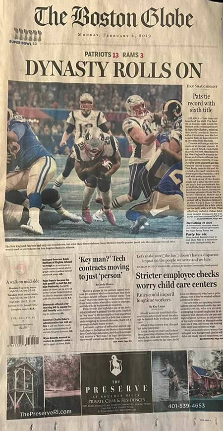 This still hangs in my office. And it will remain there as long as I shall live and work here. The first of six titles. Certainly, nobody could see the writing on that wall. Nobody could have predicted what was to come. That The New England Patriots would go on to win SIX SUPER BOWL TITLES. Nobody saw that coming. Last week I wrote about the hit that Mo Lewis of the NY JETS put on Drew Bledsoe late in the 4th qtr as Bledose ran for a first down. He didn't get the first, nor did we win that game. We lost 10-3. My son Max and I were there. The most significant event of that game was when Bill Belichick and Charlie Weiss looked over at the rookie back up QB and told him to get out there. If you remember I looked at my son Max and said: “ We’re outta here Max, the season is over.”