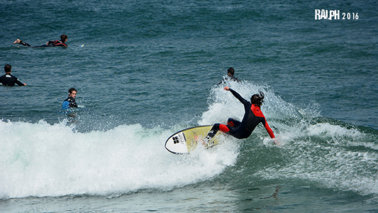 Kevin Grondin is one of the GOOD longboarders we have here. And any advice he gives to any surfer at any age should be taken seriously. Trust me, he knows more than you think. And he's easily and eagerly accessible to chat with you. In person only. He is old school when it comes to computers and smart phones. Just as well. Talking surfing requires certain hand moves. Like the one he's showing Mikey Moran here.