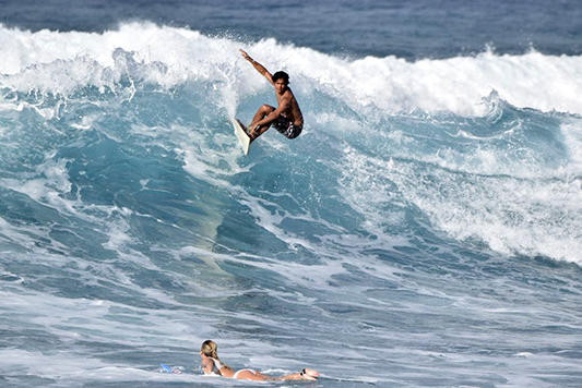 (Above) Kainalu Nichols carving off the top of a North Shore wave.