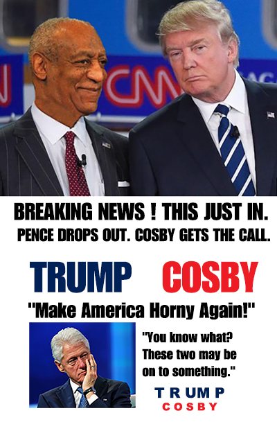 so much that Mike Pence has dropped out of the race. It's true. And now, BILL COSBY has replaced him. These are desperate times