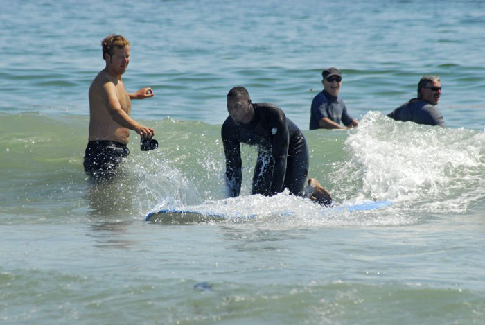 prospects for surf looked slim at best. Dam the torpedoes, we're making this happen with or without surf. The morning of the event, a funny thing happened. The surf came up. Not the kind of surf we would like but more than enough surf for any beginner to have fun in. And the key word in surfing has always been "fun." There was not a single cloud in the sky and...the water was warm. You didn't even need a wetsuit. It was that warm. The vans showed up and the Vets and their families poured out at 10th Street and stood and looked over that cement wall at the surf for the first time and smiled. We all smiled. We all clapped and cheered and the rest as they say...is history. Michael introduced the Vets to the local Surf community and we were off. The