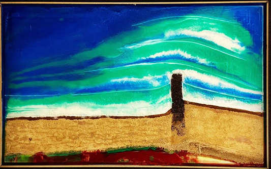 How about the fact that Stan keeps reinventing himself with his unique style and technique with a series called "Bathymetry". To hear Stan describe it in his own words. "This body of work notes a bit of a departure as I am much less reliant on paint and am leaning towards varnish glaze in the extreme. The subject matter also pays deeper attention to the total environment beyond the waves. Land contours, flora, tides, weather all take a primary role in the paintings." The following quote from the NOAA website was a guiding principal: