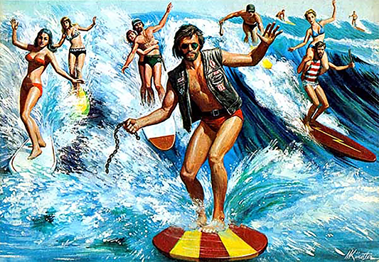 I'm not sure if there's some kind of resurgence in SURF ART from the 50's and the 60's but it did seem a little ironic that I found both of these within days of each other. SURF BIKERS and SURF COMMANDOS. That's some far out Surf art if there ever was some. Personally I found both of these paintings amusing. They are campy, fun, and far fetched. And I suppose in this crazy world that we all live in today, it's just what we needed.
