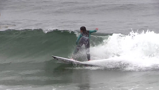 This video frame grab? Five young girls dragging their soft-tops out into some serious surf. None of them made it out. But I often wonder how many of them tried this again. And if they did, did they catch the buzz? Because this is where it starts. It's not easy being a surfer, and it's especially not easy being a woman surfer from Northern New England. It takes a lot of courage and determination to be a surfer from New England. Multiply that by 10 and you get some idea what it's like to be a woman surfer from here.
