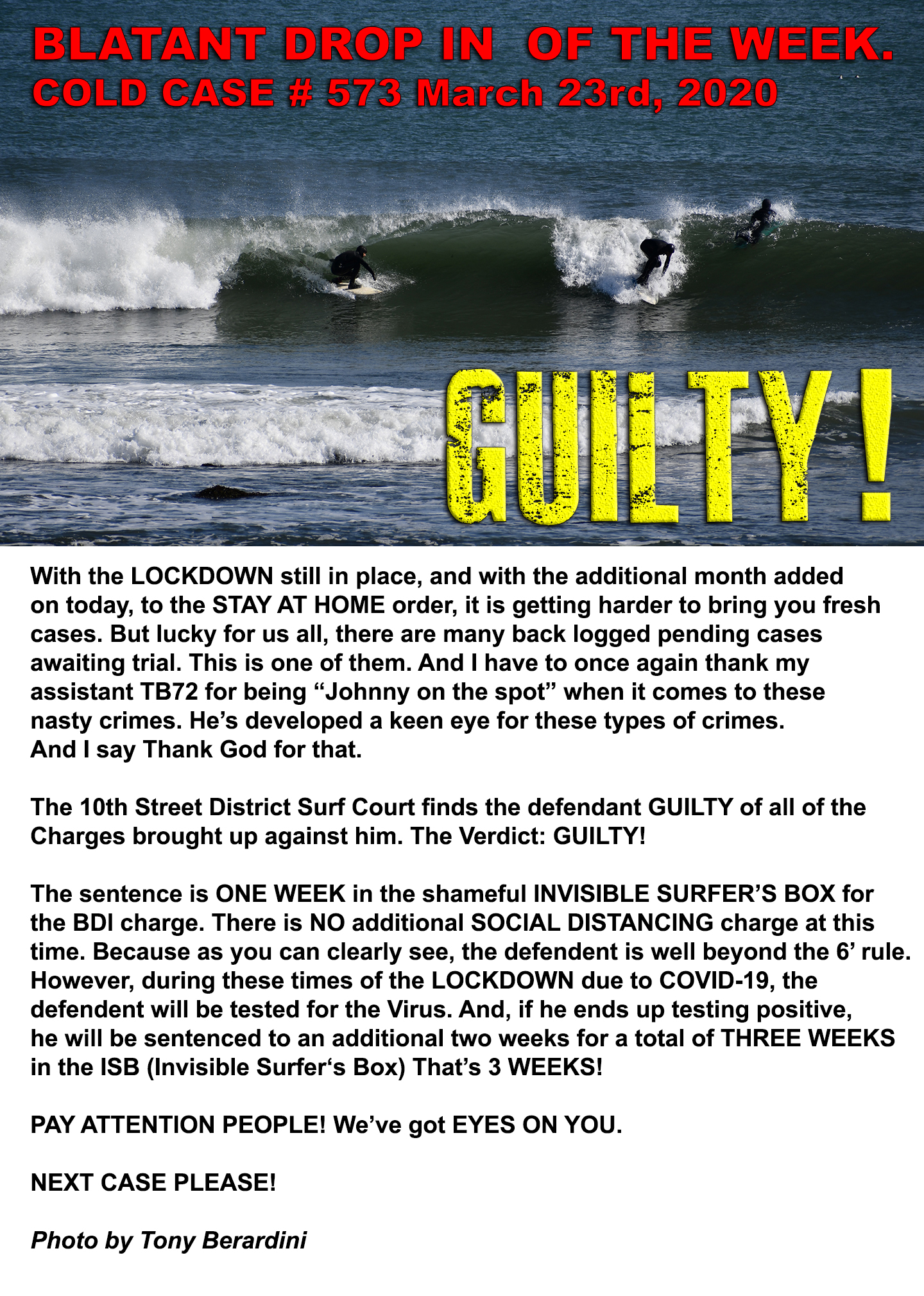 went out and caught some waves during the LOCKDOWN. That was disheartening. Surfers have always been "outside of the box" kind of thinkers. But when fellow surfers try to shame those who used common sense, and some creative ingenuity to get a few waves? That was in of itself, shameful. They should be ashamed of themselves. What you should be doing is tipping your hat, and giving a wink to those who went beyond the "absurd political thinking" and found a way to catch waves. And they did it, without spreading the virus.