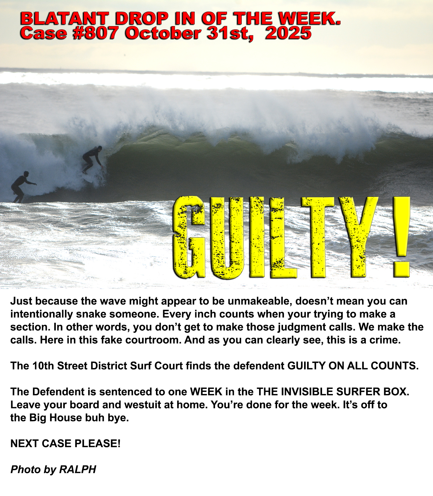 (Above) All Rise: The 10th Street District Court Of Surf is Now in Session. The Honorable Judge RALPH presiding. Case # 807 BLATANT DROP IN OF THE WEEK. Click the image above to see the outcome of this Surf Crime and the verdict that was rendered.