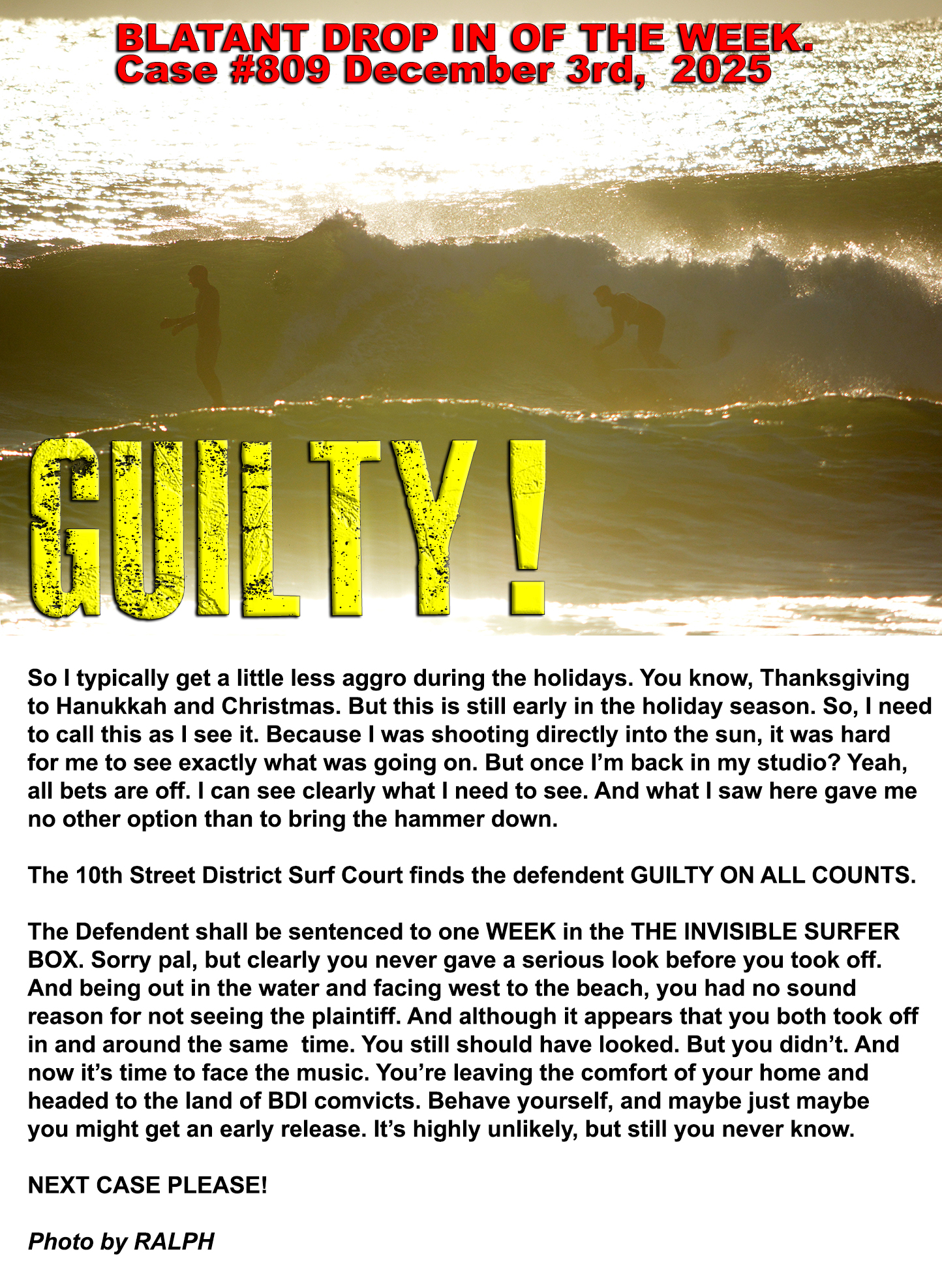 (Above) All Rise: The 10th Street District Court Of Surf is Now in Session. The Honorable Judge RALPH presiding. Case # 809 BLATANT DROP IN OF THE WEEK. Click the image above to see the outcome of this Surf Crime and the verdict that was rendered.