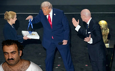 So the crooked folks at FIFA came up with this phony baloney medal to stroke the fragile ego of POTUS. The absolute ass kissing that has been going on with this administration is nothing short of nauseating. My God, it's like watching a cult documentary the way they kiss his ass and feet. Good lord people snap out of it.