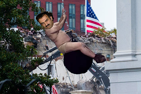Now would ya look at Ole Khaliddy here! Swinging on a wrecking ball at the East Wing like Miley Cyrus. How the hell did he get past security? I even heard he had her song "Wrecking Ball" playing over the PA system. I figured he'd be there doing a story for the GITMO GAZZETTE. But this? This I did not see coming. The things the Sheik will do for attention.