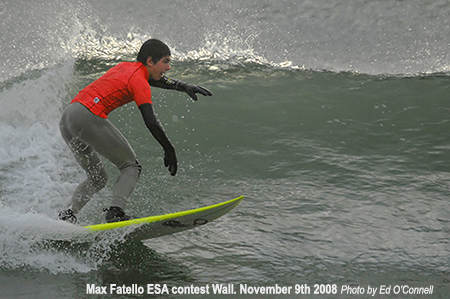 This is Max Fatello surfing in a ESA contest at the Wall on November 9th, 2008. Back when Lenny Nichols and Bob McNeil ran the show. Those were fun times for all of the ESA families. I miss those days. . Photo by Ed O'Connell