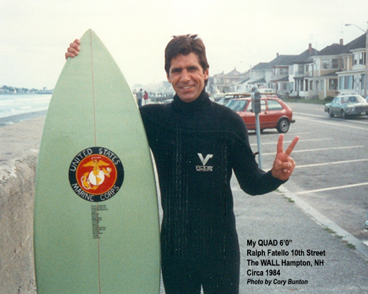 I think I had one of the first quads here in Hampton. This was shaped by my buddy Ric Aho at NOMAD surfboards. I know I drove him crazy with my artwork requests. For instance, I wanted the main color of the board to be Olive Drab Green. But I got Diarrhea Green instead. And I wanted the Eagle, Globe, and Anchor symbol on the bottom with a list of places I had been. The board itself was like surfing on a sled. It was too boxy and too sled like. My son Max ended up using it when he was a grom. He could actually knee paddle.