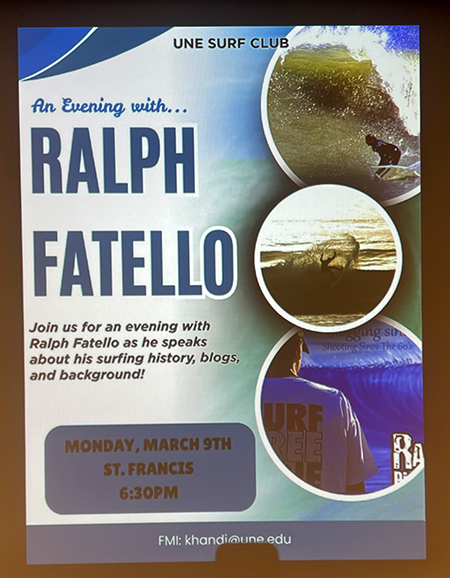 I was looking forward to my speaking engagement on Monday March 9th, 2026 with the UNE Surf Club tonight. Should be fun. I always start my talks by asking: "Do you want the filtered Ralph? Or the Unfiltered Ralph?" I should back up a little here. I was contacted back in 2025 from a student at UNE who is the president of their local surf club. She had seen my Blog and wanted to know if I would be interested in coming to the campus and speak about surfing.