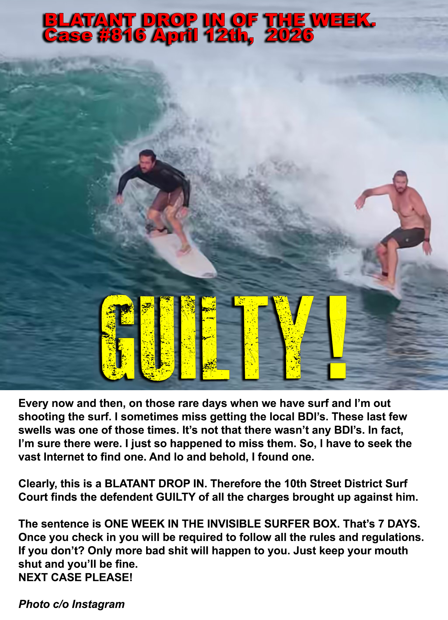 (Above) All Rise: The 10th Street District Court Of Surf is Now in Session. The Honorable Judge RALPH presiding. Case # 816 BLATANT DROP IN OF THE WEEK. Click the image above to see the outcome of this Surf Crime and the verdict that was rendered.