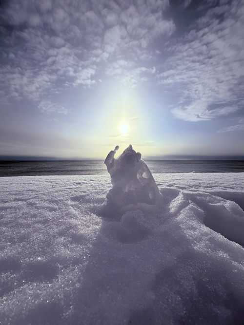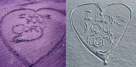 The one on the left was done 15 years ago on Valentine's Day in 2011 when I was surfing everyday in Memory of Molly Rowlee. I caught my wave that day and as I was l leaving the beach I wrote this Valentine day message in the sand. The one on the right was done 15 hours before this current Valentine's Day. I wrote the new one in the snow behind our home while out in the marsh running our dog Zorro in the snow and ice.