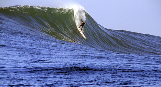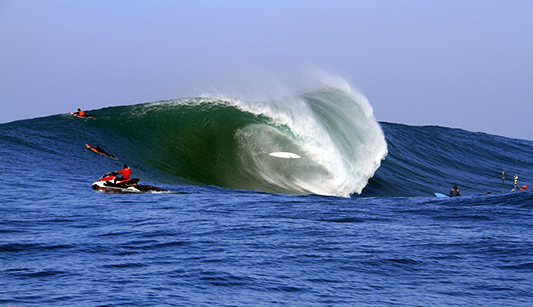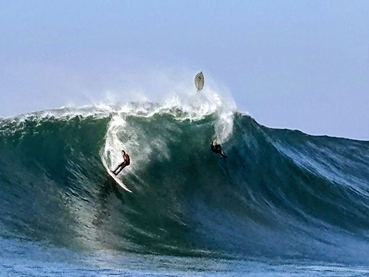 (Above) That is one big beautiful wave. Emlyn Stokes is a chip off his old man's block. His dad Peter used to surf Big Cloudbreak waves with a similar style and grace.
