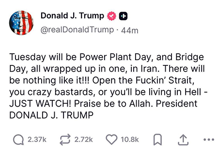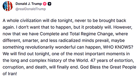 I want you all to stop and think about what POTUS said yesterday. I mean all of us. Democrats, Republicans, and Independents. He threatened to wipe out an entire civilization. My God. By the way, that post is a WAR CRIME. What he wrote here is an actual war crime. *Combined with the bombing a school and killing over 100 young school girls.