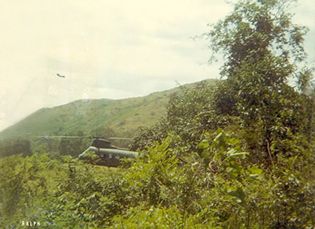 This is a photo I took 57 years ago in Southeast Asia of a CH 46 Sea Knight. We had just unloaded off this chopper and were taking cover, when I jumped up to snap this photo with my little cheap Instamatic. What you can't see or hear is the door gunner firing his M-60 into the tree line on the other side. *Note the other CH 46 flying over the mountain.