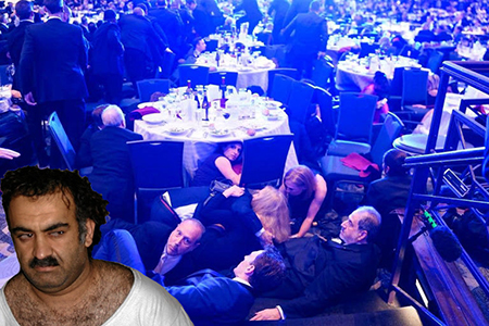Well, if there has ever been a place and time where our boy Khaliddy should have attended, it would have to be this. The WHITEHOUSE CORRESPONDENTS DINNER. Imagine how excited the Sheik was to be invited to this exclusive dinner engagement. Of course, he was slightly under dressed, but he did manage to be up front when the shooting started. And unlike the other terrified guests, Ole Khaliddy was not in the least bit afraid of the shots being fired all around him.