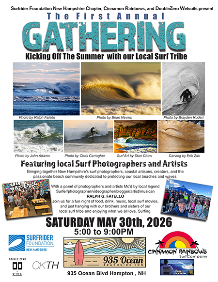 This first gathering will feature the many surf photographers and artists on our seacoast. Brian Nevins, Brayden Rudert, Chris Carragher, John Adams, and myself. We will acknowledge all the photographers who have dedicated their time and passion to document our favorite pastime, Surfing. Individuals like: Erica Nardone, Dina Crawford, Ed Moran, Tony Berardini, Martha Lardent, Jeff Crawford, Ron Freeman, Lenny Nichols, and many more. Plus we will acknowledge the late Ed O'Connell.