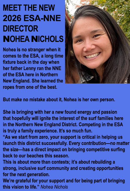 to have the ESA-NNE back on the Northern New England seacoast. It's been way too long. But the waiting is over. New Director Nohea Nichols has been well versed in the contest scene having worked with her father and mother for many years.